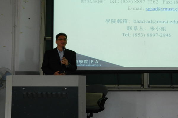 庞教授向大家介绍了一系列来澳科大读研的流程。据了解,港澳研究生是采取申请的办法,与大陆研究生考试时间不同,澳科大报名时间是在1—4月,其后在5月间在珠海进行考试,考试分为面试和笔试,申请的研究领域范围主要面向艺术设计、传播学、社会学、管理类、会计与金融类等专业。接着,庞教授重点介绍了“艺术设计实践”、“设计管理和文化遗产保护”等研究生专业的团队力量,专业成果,公司的软硬件实力等。
