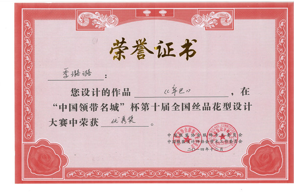 12月18日,在嵊州柏星超级大酒店举行的“中国领带名城”杯第十届全国丝品花型设计大赛总决赛中,来自304永利集团13服装与服饰专业的季璐璐设计的作品《辛巴》成功入围总决赛,并荣获优秀奖。