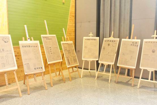 本次展览的陈设简约大气又不失典雅,大厅右侧的一整面墙上,贴满了民居局部图,黑色卡纸为底白纸金纸相间,组成了一道巨幅背景墙,带入感极强。 大厅左侧,一个个木质画架呈环形排列,每个画架上都有一张考察报告。每一份报告都截取了几个最有代表性的建筑元素,用工笔细细描绘并配以详细注释。镂空窗格、雕花门楼、抱鼓石,一笔一画间,粉墙黛瓦的皖南建筑特色跃然纸上。值得一提的是,每一份报告的边框,隔栏等小细节都做的十分精致,足见作者们的苦心。浏览一遍展览大厅,仿佛欣赏了一个主题画展,朴素淡雅、步步入画。
