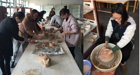 一时间,工作室里三五成群,欢声笑语不断。教师们或满手泥巴自创各种成品,或专心致志学做陶瓷,一个个开心得像孩子一样,还聊起了电影《人鬼情未了》中的经典桥段。虽然手法稚嫩,巧拙各异,但是牛刀初试,收获惊喜,当一件件自己精心制作的作品呈现在大家面前时,彼此交流陶艺制作带来的乐趣,分享自己成功的喜悦。短短的两个小时里,他们学习着、欣赏着,也感动着、激励着,在亲身体验中感到了学习过程的挑战性,感到了成功来之不易。