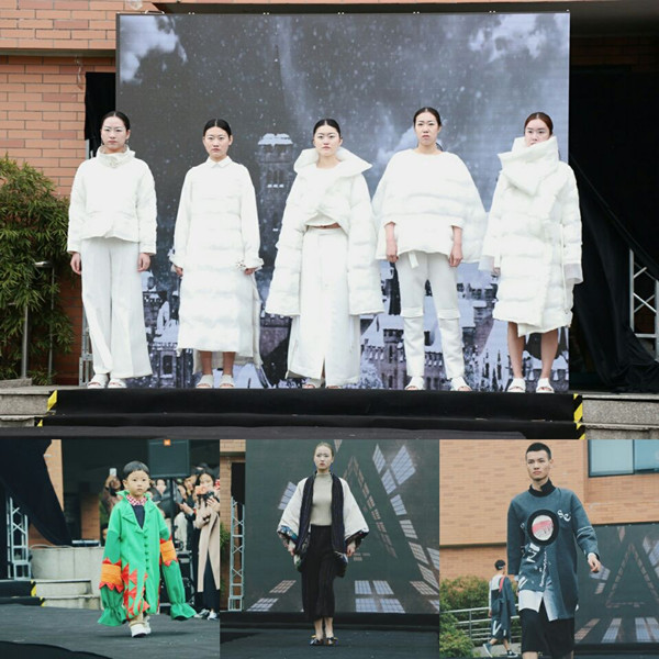 本次毕业设计作品展是艺术设计四个专业首次联袂展出,毕业展还在ZAKER浙江平台进行了全程视频直播。作品展分动态走秀和静态展示两个环节。服装与服饰设计专业动态秀首先开始。黑色皮质长裙以其大胆新颖的裁剪,突显新时代女性的个性与魅力;粉色丝绒长裙无论从服装创意、肌理质感,都让大家感受到现代女性的优雅和衣服的飘逸之美;不规则形状裁剪的童装显得小朋友活泼可爱。