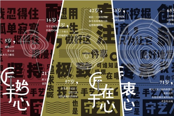 《始终》项目运用树的年轮为设计理念,年轮由小到大,象征匠人的少年、中年、老年、人生三个阶段同时,也暗含了随着年龄增长,而不断沉淀并贯彻少年、中年的匠心精神。海报颜色采用“红黄蓝”三原色,一方面红黄蓝作为三原色,有纯粹之意;另一方面从红黄蓝出发,可衍生出其他不同颜色,有创新之意。颜色含义与背景文字相结合,从而体现了匠心精神的内涵。