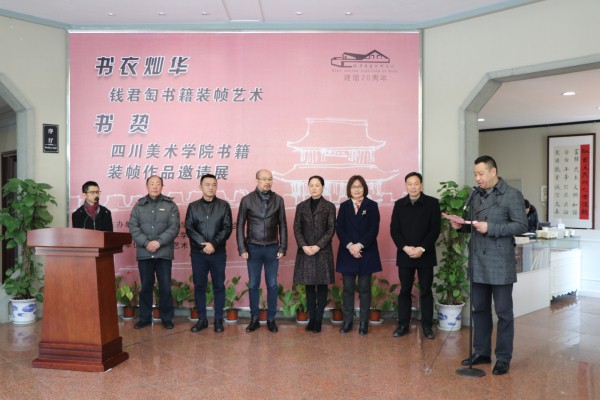 参加此次开幕式的嘉宾有:中国美协插图装帧艺委会委员、广州美术公司版画系副主任肖勇,中国美协插图装帧艺委会委员,浙江美术家协会连环画、插图装帧艺委会副主任,宁波大学科技公司设计艺术公司副经理张彤,四川美术公司版画系版画与印刷工作室主任谭璜等艺术届翘楚。在开幕式结束后,师生一行首先参观了研究馆中央大厅内钱君匋先生创作的篆刻、书法、绘画、书籍装帧等方面的作品,聆听了馆长对钱君匋先生生平的介绍,较为全面地了解了钱君匋先生的艺术风格、观点和成就;随后,来到二号展区,这个展区是四川美术公司带来的书籍装帧作品,它区别于传统书籍,是利用特种纸材、皮革、金属、陶土等材料作为制作书籍的材料,融合设计者的设计理念与审美理想,以此来表达对书籍的敬畏。它所带来的视觉冲击,对公司师生了解书籍本身的内涵有着不可估量的作用;同时,提升了看待书籍装帧的审美眼观。