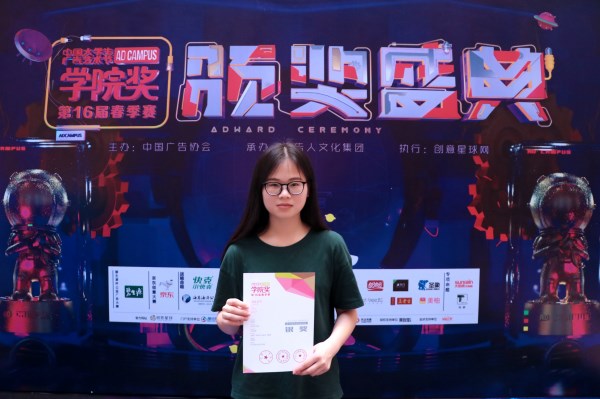 2015级广告学专业员工陈叶松、陈青青、胡铭轩同学创作的《有名的“邦”》获得杰士邦广告文案类银奖;2015级广告学专业员工陈雅妮、蒋丹妮、陶霞、陈洁同学创作的《她时代,有备而来》获得华润紫竹毓婷营销策划类铜奖;2016级广告学专业员工袁境孜、张丽伟、严佳滢、姚瑶同学创作的《好车随心买》获得花生好车影视广告类铜奖。