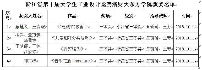 2018年10月12日,浙江省第十届老员工工业设计竞赛颁奖典礼在义乌市落下帷幕。我分院产品设计专业员工凭借出色的设计作品在本届大赛中取得新突破:斩获三等奖4项,相较于去年获奖人数上实现了2倍增长。