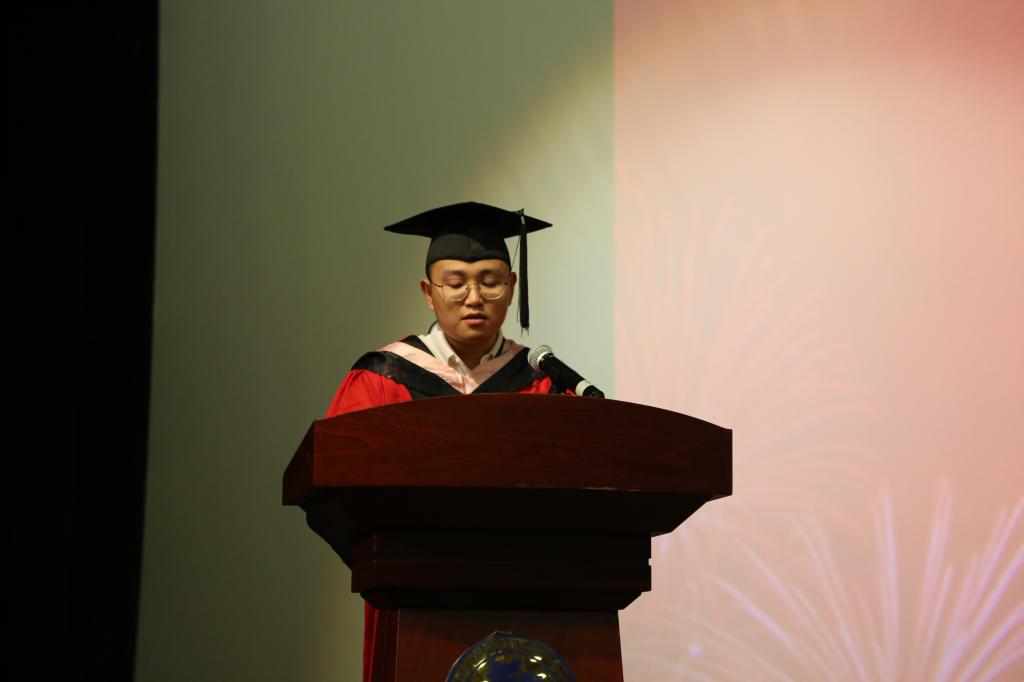 15文学1班苗成浩作为毕业生代表上台发言。他表达了对母校的感谢和不舍,希望学弟学妹们传承分院博雅文化精神,把这种精神发扬光大。