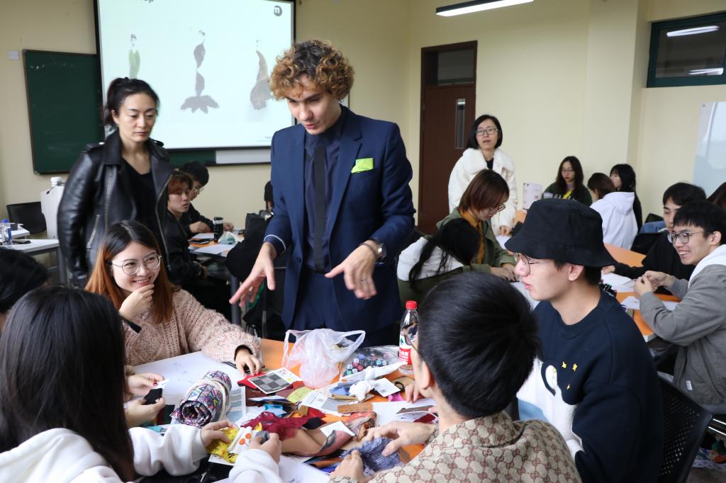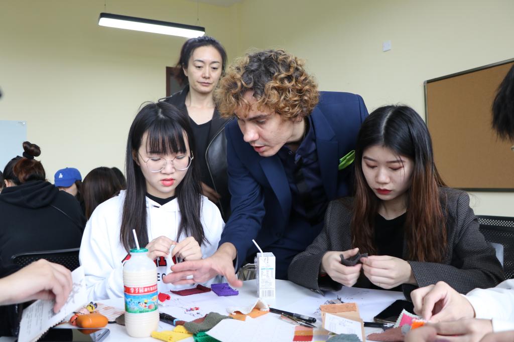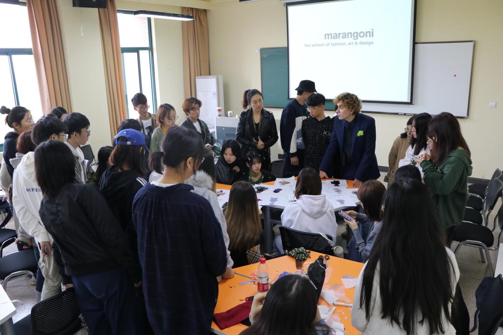 接着,Artem老师带来了一个马兰戈尼公司服装设计常用的人形牌,要同学们用现有的面料做出服装设计模型。他不断的提示道:“在创作的过程中不要担心、害羞,可以大胆的进行创作。”