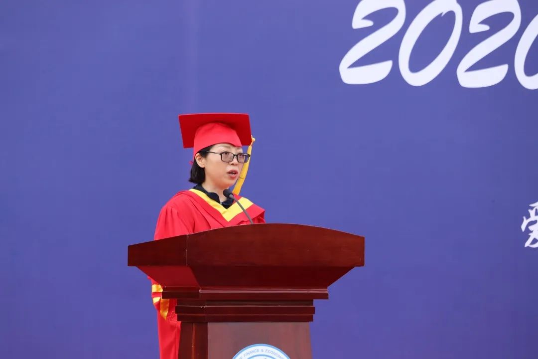 产品设计专业李孙霞老师作为教师代表上台发言。她希望毕业生们无论何时都可以拥有一颗善良、真诚的心,学会包容,学会理解,学会感恩,在未来的生活中可以收获更多。
