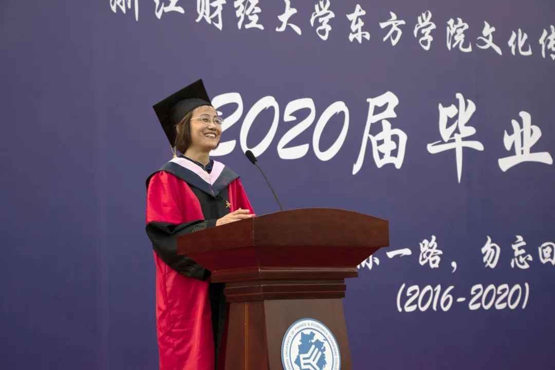 在校生代表17文学1班汪佳丽上台发言。她对初入大学时学长学姐曾经给予过的帮助和陪伴表示感谢,并送上了她对即将踏入社会的学长学姐最美好的祝愿:“愿有前程可奔赴,亦有岁月可回首。”