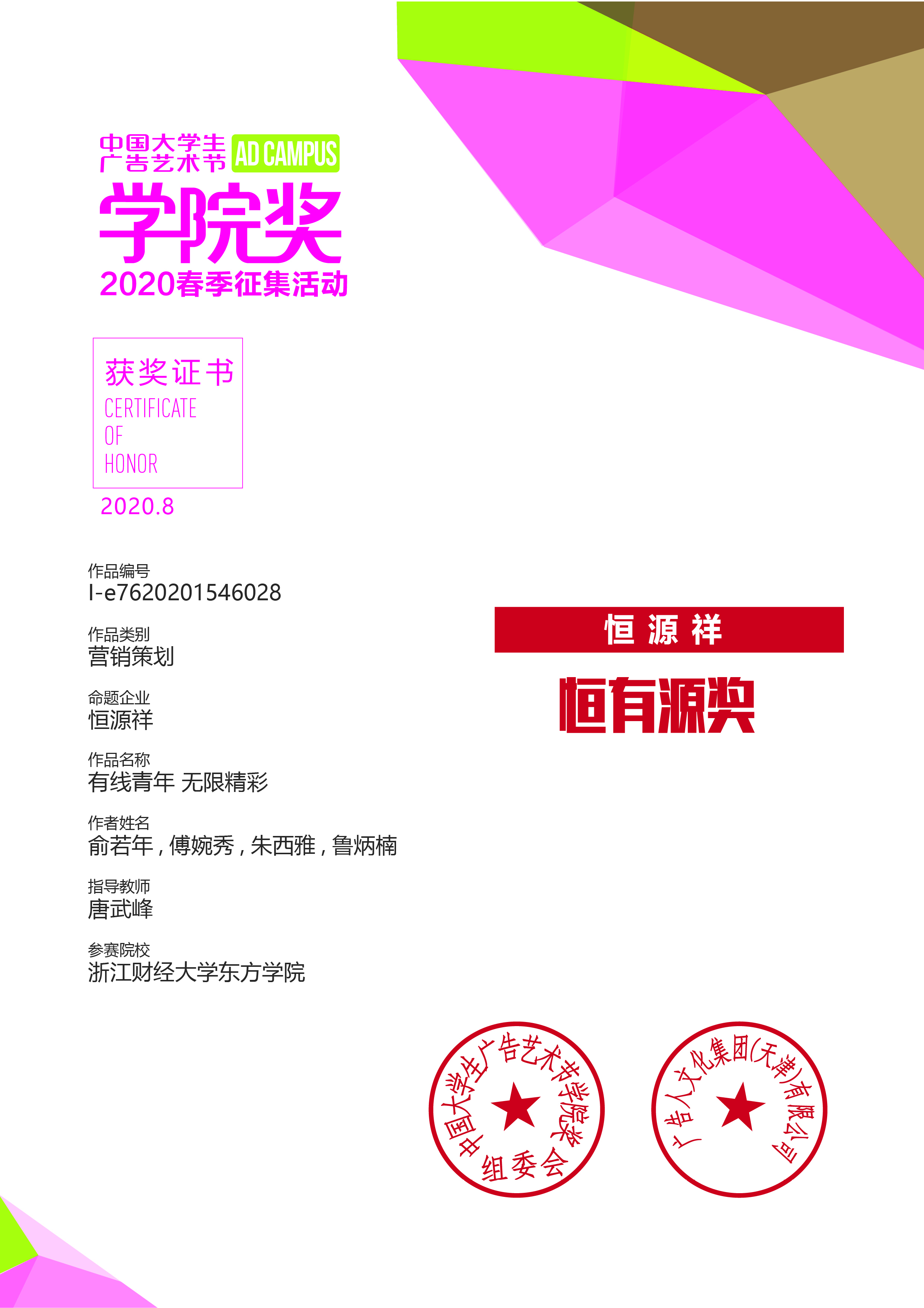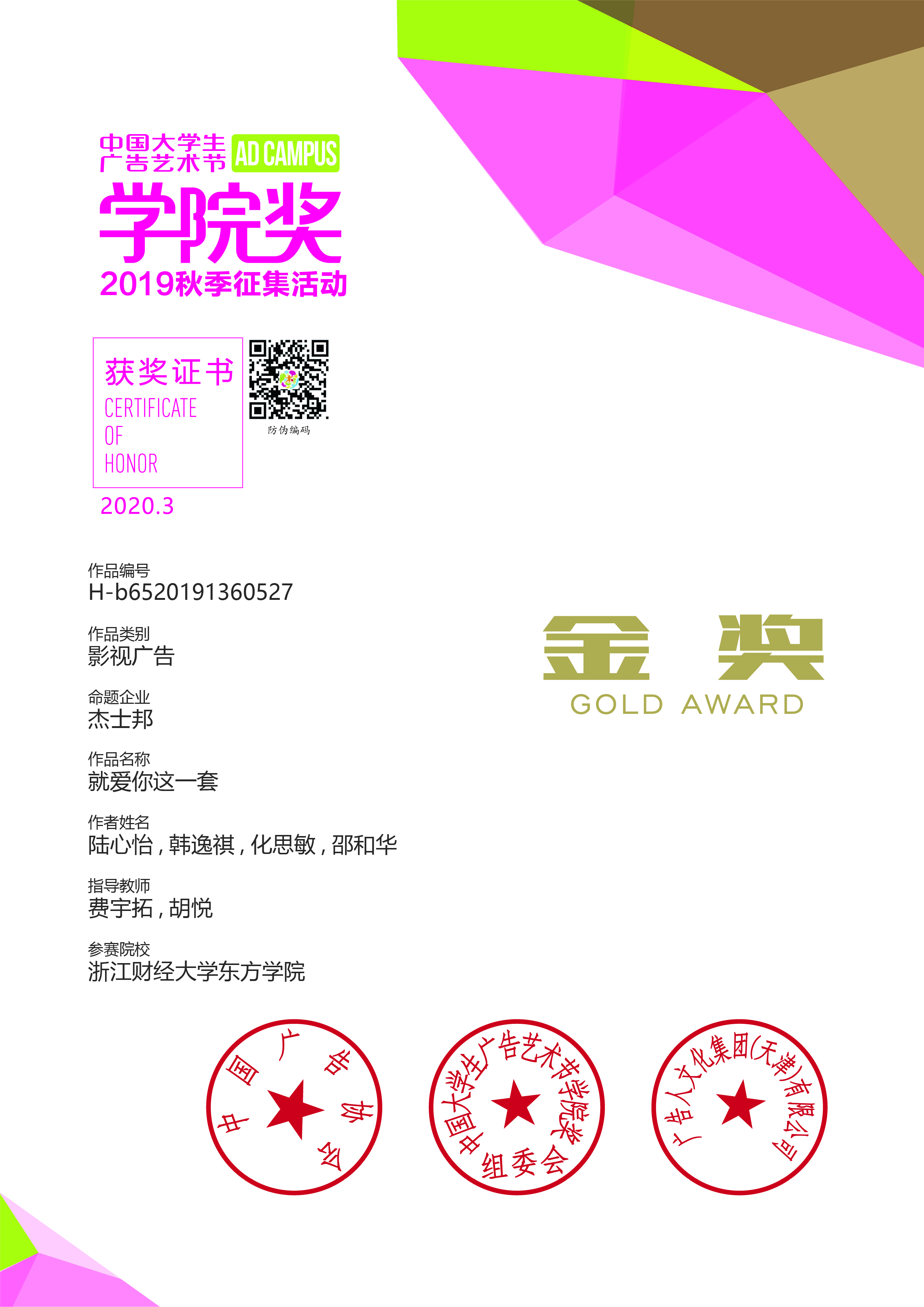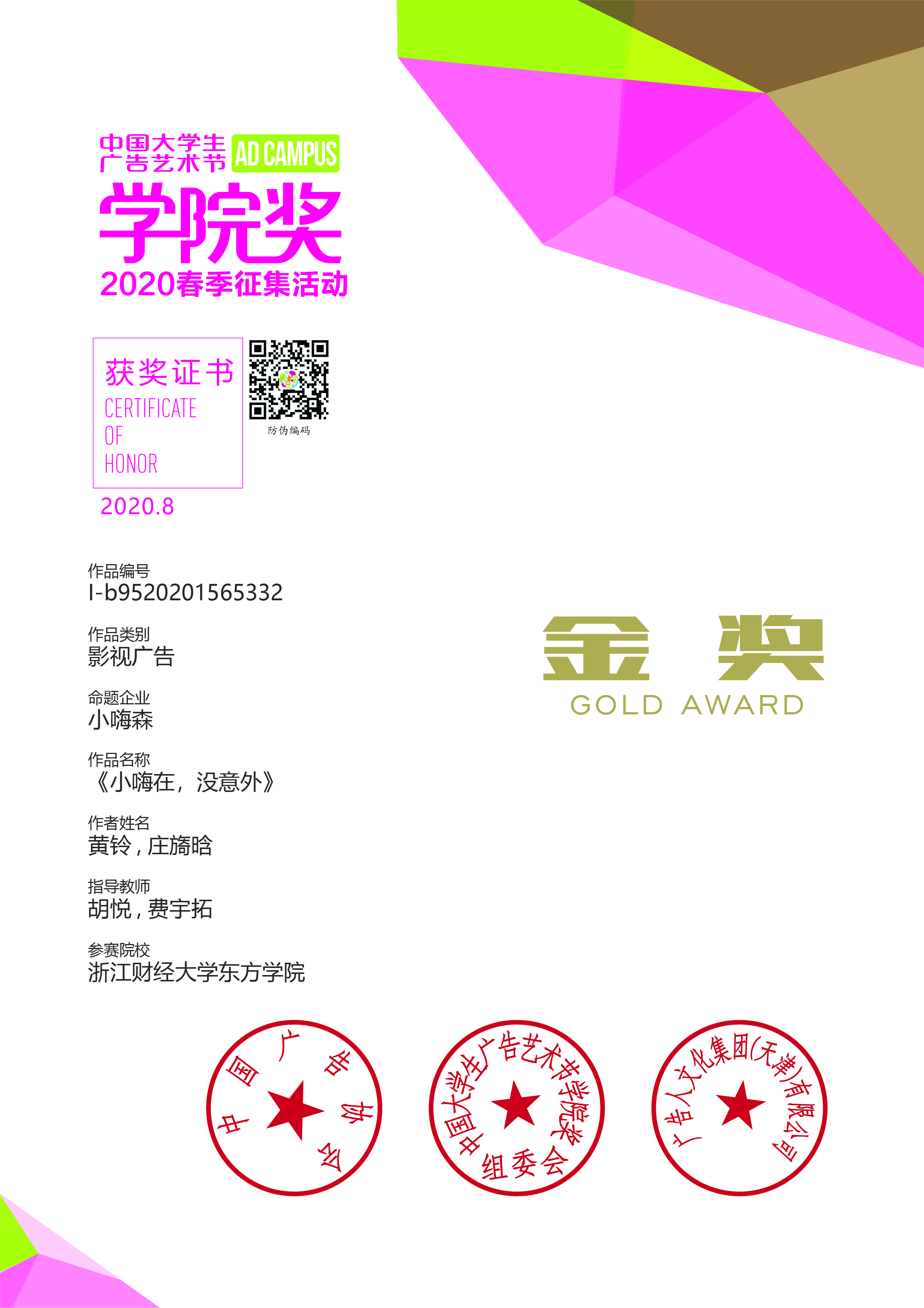 大广节公司奖自启动以来,共收到包括清华大学、北京大学、中国传媒大学在内的1500余所高校的几十万件参赛作品。公司同学在疫情的影响下,依然热情不减,踊跃参赛。通过一轮又一轮的严格筛选后,能留下的参赛作品屈指可数。对于他们来说,获奖不仅仅代表着眼前的荣誉,更代表着背后无数的心血。值得一提的是来自18广告1班的陆心怡、韩逸祺、化思敏、邵和华团队,这是他们第一次投稿影视类广告作品,费宇拓老师评价优秀的他们凭着初生牛犊不怕虎的精神,在还未开始学习相关专业技能的情况下,凭借着一腔热情和超强的自学能力完成这部短片,获得公司奖金奖的优异成绩。同样来自18广告1班的傅婉秀、鲁炳楠、朱西雅、俞若年团队,在公司奖2020春季赛征集活动中也崭露头角,在学习了一个学期的广告策划后,通过不断地修改、排版甚至是推翻重来他们提交了第一份策划参赛作品,得到了品牌方的赏识与肯定,获得恒源祥企业奖。17广告1班的黄铃、庄旖晗团队同样在比赛中大放异彩,一举夺得影视类广告金奖,她们的创意和执行力有目共睹,在团队中她们一个负责统筹兼顾,一个负责雕刻细节,这样的性格让她们在合作中可以互补,从而打磨出令人满意的作品。