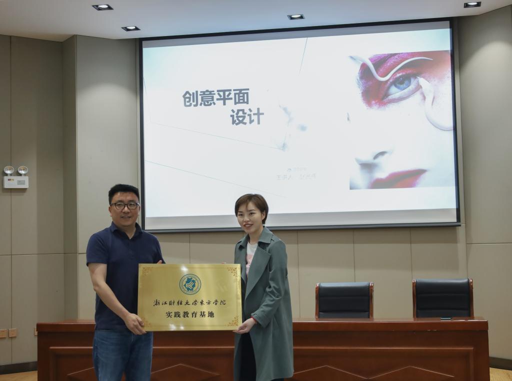 2021年4月27日下午13:30,阿珂老师在J5–101开展“创意平面写真造型设计”讲座。讲座正式开始前,胡悦副经理为杭州摩可文化创意有限公司授牌,标志着摩可文化正式成为公司实践教育基地之一。