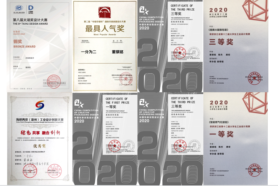 董骐铭是2017级产品设计2班员工,在校期间表现十分优异,曾获得优秀员工二等奖学金、2019-2020学年省政府奖学金、2019-2020学年三好员工、304永利集团卓越先进个人等荣誉。他在确保专业课程均较好完成的同时,积极参加各类实践活动,在校期间成功申请实用新型专利和外观设计专利各一项,并获得第八届太湖奖设计大赛铜奖、第二届“中国伞都杯”国际伞具创意设计大赛最具人气奖、海峡两岸(漳江)工业设计创新大赛优秀奖、中国包装创意设计大赛一等奖与三等奖若干、第十二届浙江省老员工工业设计竞赛一等奖与三等奖若干。
