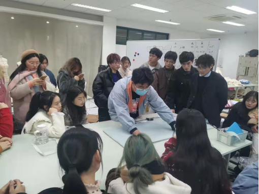 分享会结束后,储老师在一号实验楼教室中,为员工亲手示范了旗袍的剪裁制作流程。储老师从尺寸测量开始,完整地展示了一件民国风貌的旗袍制作工艺,包括教授员工粉线的使用方法,偷襟工艺,归拔等专业工艺。传统中式平裁与西方立裁工艺有着较大区别,这也是员工日常接触较少的服装制作方法,都在此课堂得到了完美的演绎和呈现。