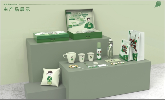 参赛员工经过对当地槲包文化的调研,凝练出槲包特征与地方特色,设计了“槲佳人”这一IP形象,赋予其“槲包礼佳人,情归于本真”这一真诚的理念。以当下流行的国潮IP为主要特点,从槲叶中提取颜色,并选择绿色作为主色调,体现“天然健康,回归本真”的理念,给人以感官上的舒适感。