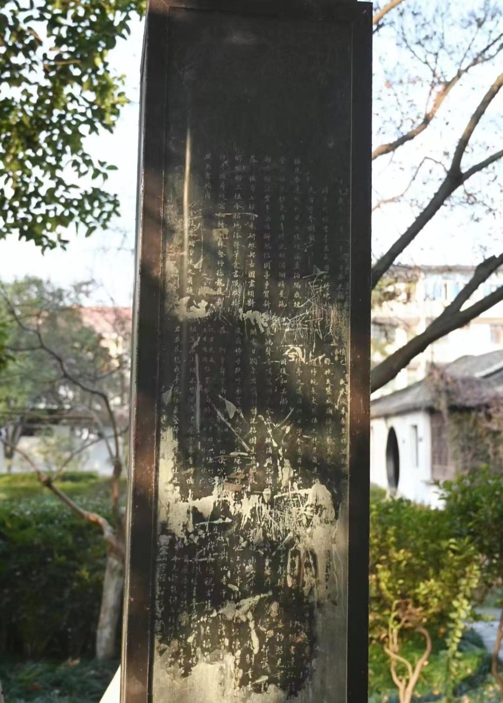 竹垞故居内陈设雅致,清幽的长亭,弯弯曲曲的小桥,郁郁葱葱的竹木,体现出质朴典雅、错落有致的江南庭院布局风格。正如先生的号一样,院内多种竹子,显示出主人对竹的喜爱。故居内多陈设狮子石墩,形态各异,生动多姿。进门往右走,是“潜采堂”,是朱彝尊的藏书之处。院子中间,有亭翼然,就是著名的“曝书亭”。亭子的石柱上,刻有汪楫书、阮元摹作的楹联:“会须上番看成竹,何处老翁来赋诗。”另有朱彝尊词作《百字令》及清代名人雅士所题诗词。为了防止文物遭到腐蚀、损坏,石柱外周围有玻璃罩。绕着院子悠闲走上一圈,再走过曲折的水上回廊,我们就结束了竹垞故居的行程,也结束了这一天的研学之旅。