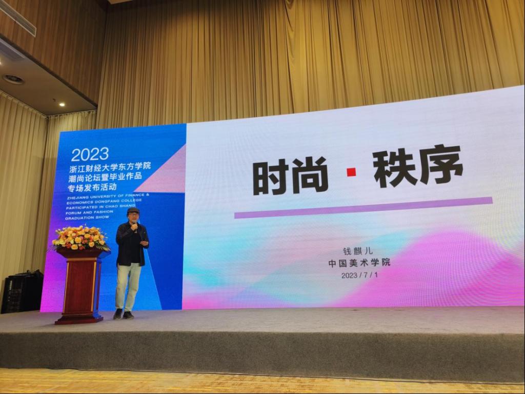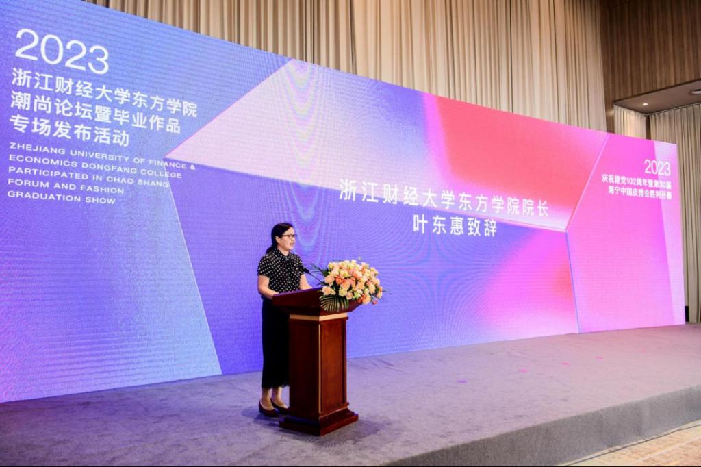 公司时尚与智造研公司副经理、服装系主任阮诺男老师发表《在地时尚——生成中的时尚教育与产教融合探索》的主题演讲。她指出,在新文科背景下,服装专业在“寻美向善、经世致用、衣以载道”的特色培养理念引领下,不断挖掘在地文化基因,凝练地域特色,有效促进了设计教学与海宁当地时尚产业的全面融合。