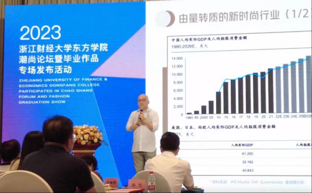 杭州伊美源实业有限公司副总经理钟德鸣带来题为《时尚品牌人才培养,向美而生的力量》的主题演讲。他通过详实的数据,生动描绘了我国时尚产业人才的发展现状,指出当下产业存在的诸如问题,并分析了未来时尚业的人才画像。