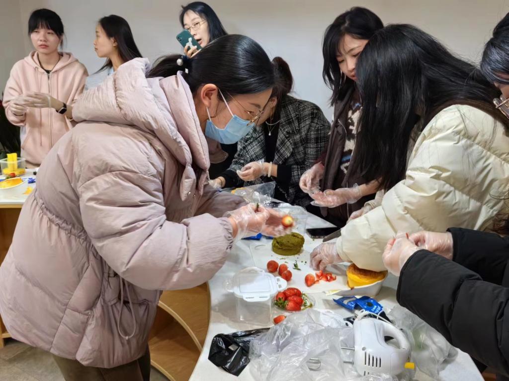 活动现场,笑语盈盈,香气扑鼻。桌上摆满了蛋糕胚、奶油奶酪、水果和各式配料,让人目不暇接。特邀的烘焙老师耐心地向大家讲解蛋糕制作的步骤和技巧,从选择材料到称量比例,从混合搅拌到装罐造型,每一个环节都要求精确无误。女教师们一边听讲一边动手实践,享受着亲手制作美食的乐趣。