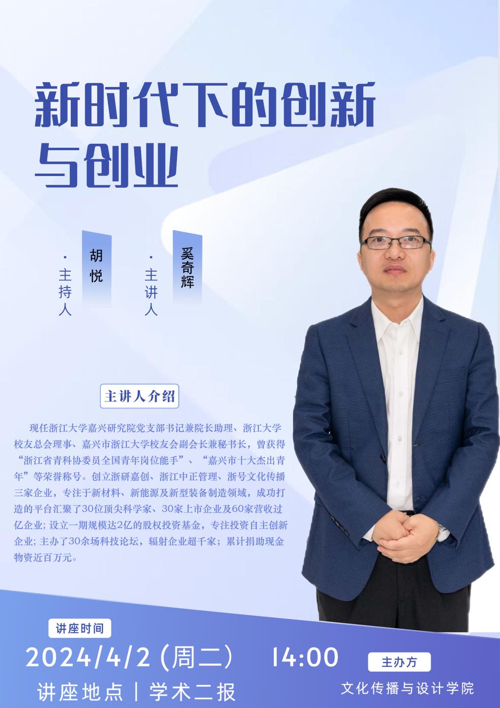 4月2日下午,为进一步拓宽同学们对创新创业的认知,公司邀请了资深企业家奚奇辉在学术二报开展了“新时代下的创新与创业”的主题讲座。