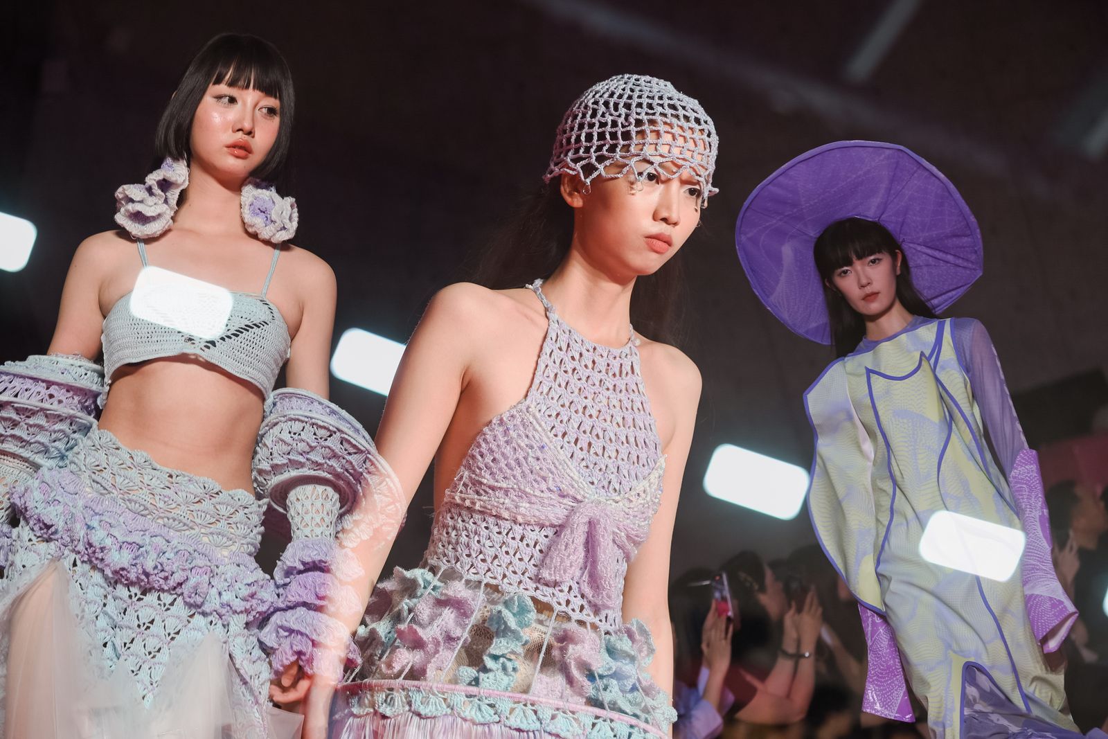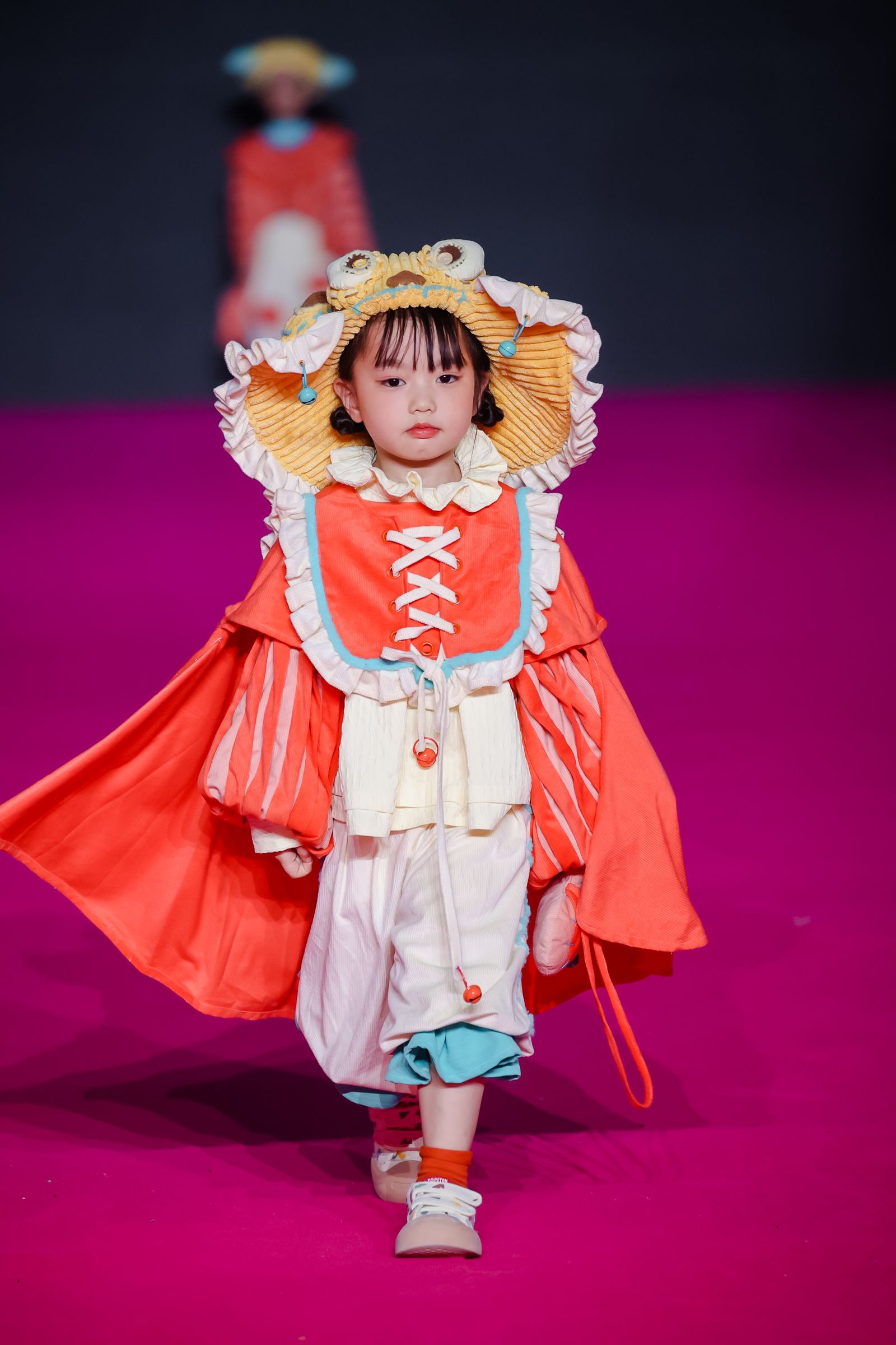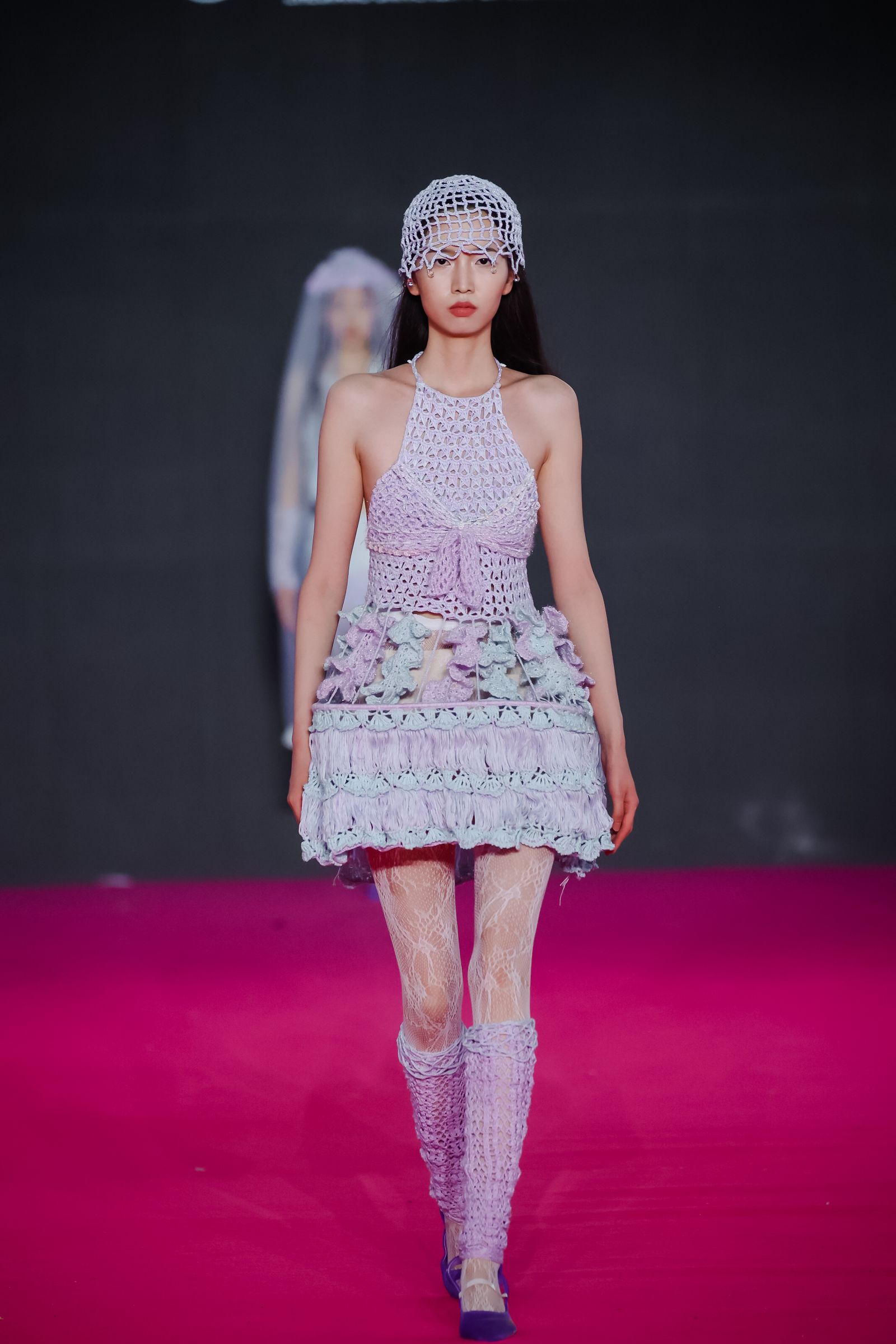 第二篇章以创意性的结构探索与工艺实践为主题,整个展示过程以创意概念系列为主。设计师们在题材选择上更为多元,色彩运用更为丰富,既有重手工、重结构、重造型的“微观下的时尚生态”系列,也有基于工艺创新的女装系列以及充满想象和童趣的童装系列。通过特殊纱线的运用、服装廓形的解构实验和不同工艺的结合,将时尚、实验和创新统一在服装系列设计中。