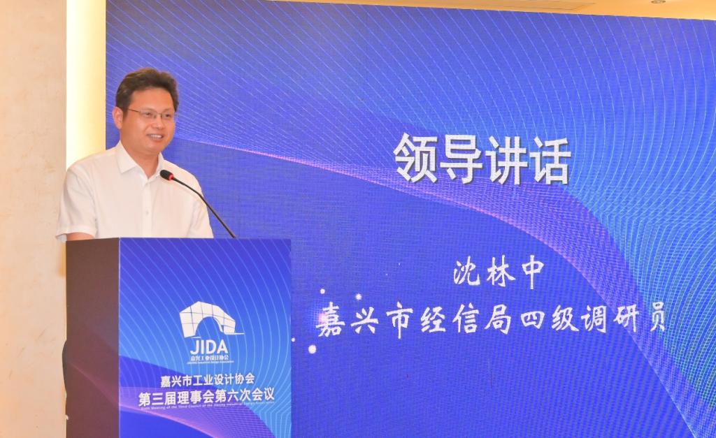 嘉兴市经信局四级调研员沈林中发表讲话,对协会工作给予充分肯定。他表示,协会在推动工业设计发展方面发挥了重要作用,并提出期望,希望协会继续努力,为行业发展贡献更多力量。