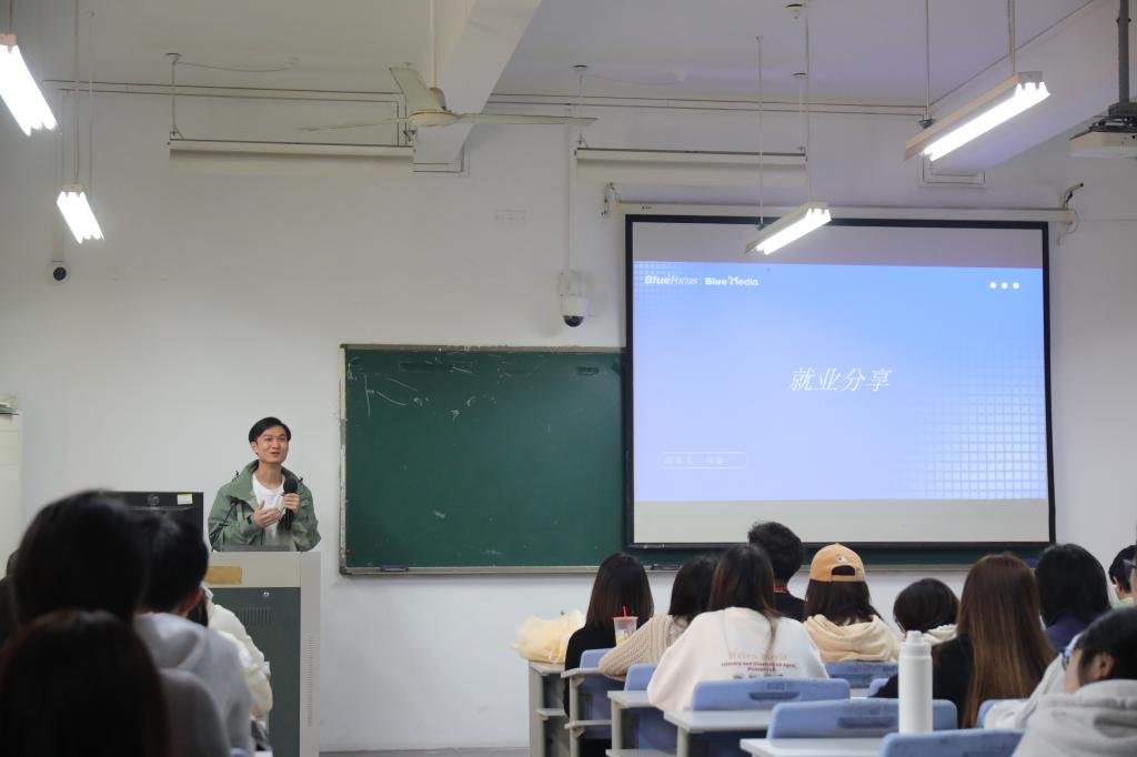接下来,易磊学长带来了他的就业经验分享。作为一位“广告土著”,易学长在蓝色光标公司工作已有一年半的时间。他从蓝色光标、计算广告、就业建议以及面试建议四个方面进行了详细介绍。在介绍蓝色光标公司时,他详细阐述了数字广告、程序化广告、计算广告等专业名词,并对原生广告、信息流广告等进行了深入分析。同时,他还分享了相关书籍,帮助同学们拓宽视野。在就业建议环节,易学长鼓励大家在工作中多思考自己的位置,多与其他节点的人沟通;他坦言,如果想从事互联网工作并完全分开工作与生活,可能性极低。他建议同学们先去做,再寻找工作的意义。最后,他寄语大家:“乱云飞渡仍从容!”