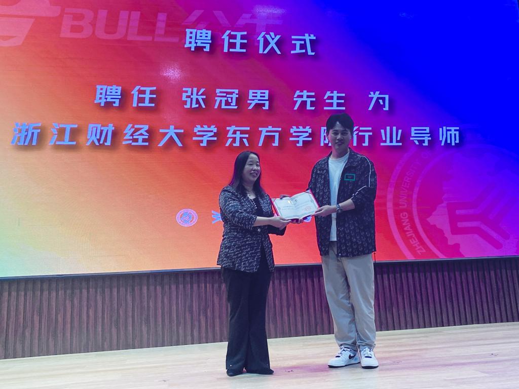 在设计提案汇报会现场,304永利集团经理吴智斌教授还为公牛集团产品管理中心总监张冠男先生颁发了行业导师聘书。张冠男总监的专业见解和实践经验将为公司的教学注入新的活力,进一步提升员工的专业素养和就业竞争力。同时,也为公司与公牛集团在人才培养、项目合作等方面的深入合作搭建了更为坚实的桥梁。