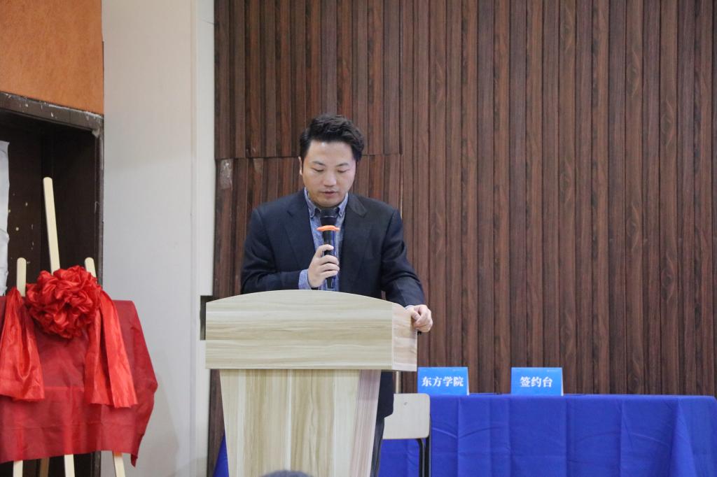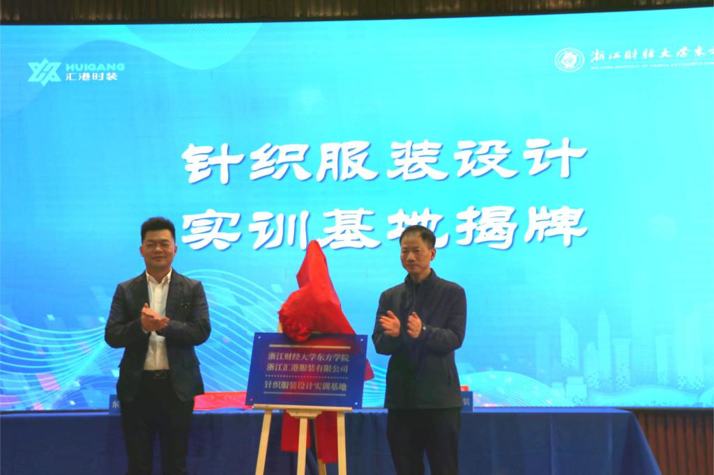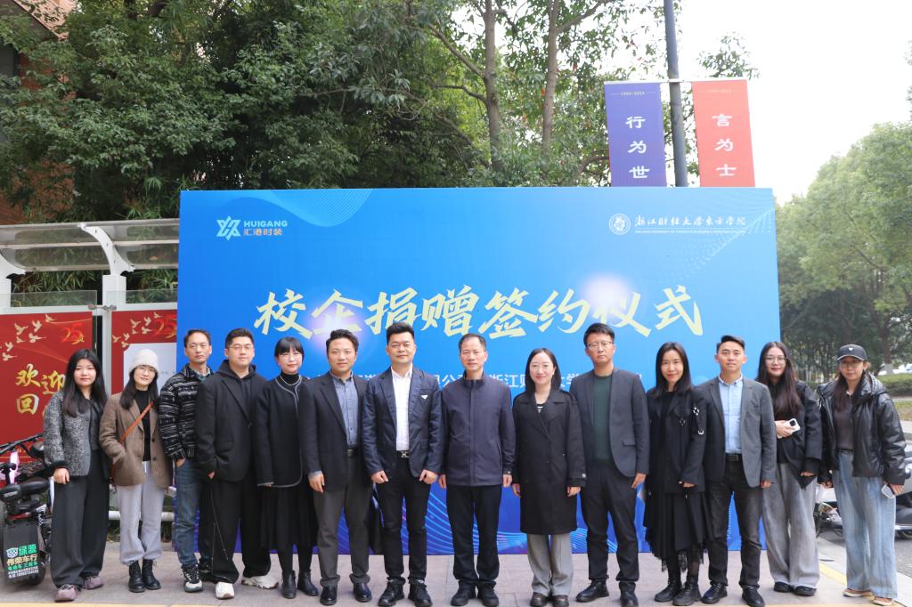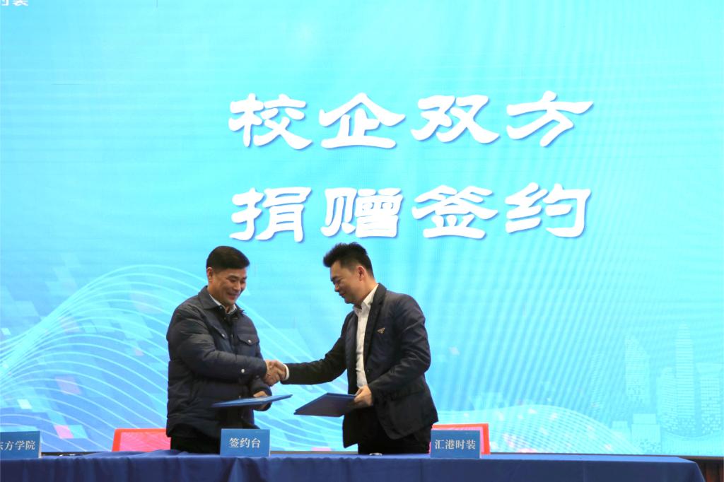 在捐赠签约环节,浙江汇港时装有限公司董事长沈强与东方公司资产管理部部长杜晗君分别代表校企双方签署了捐赠协议,并合影留念。