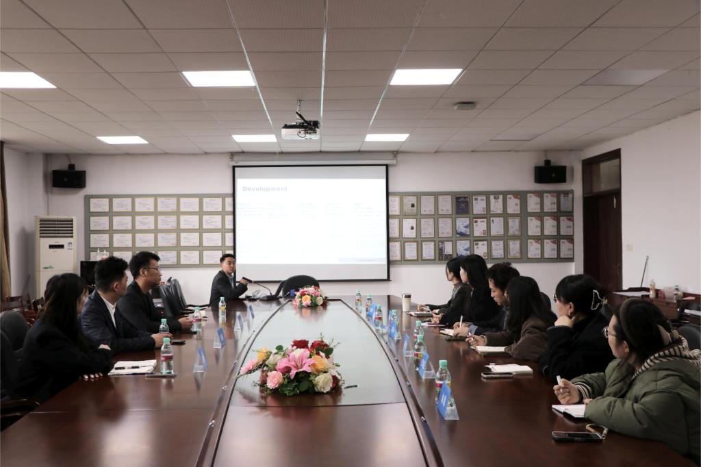 捐赠仪式在热烈的掌声中圆满结束,在阮诺男老师主持下与会嘉宾移步至2号实验楼一楼进行合影留念。合影结束后,校企双方领导及师生代表移步至二教会议室开展座谈会。座谈会中,外国语公司、金融公司代表也与会参与了讨论,与公司及浙江汇港时装有限公司共同就产教融合、就业需求等方面与企业方用人需求、合作需求展开交流。