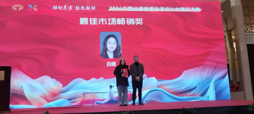 近日于苏州举办的2024中国软装创意大会暨金纺锤·中国软装美学空间设计大赛、2024中国丝绸家居生活设计大赛总决赛中,永利集团304永利集团的白璐老师凭借其出色的设计才华,为海宁市斯泰堡纺织有限公司设计的丝绸面料陈设空间作品,成功荣获全场唯一的最佳市场畅销奖。为公司赢得荣誉的同时也彰显了横向科研成果赋能校企合作转化的丰硕成果。