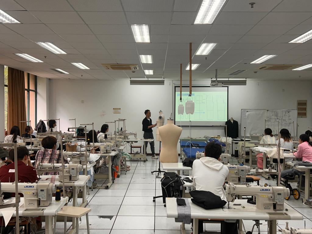 老师示范结束后,员工们逐一进行实践操作,从面料裁剪到粘合衬粘贴,从车缝省道到安装拉链,每一步骤都体现了员工理论转化为实践动手能力。余老师巡回指导,及时纠正员工的操作误区,并演示关键工艺,如“门襟拉链安装位置”和“车缝倒针固定”。这种“边学边做”的模式,有效的将先修课程服装平面纸样知识应用到实践中,不仅加深了员工对前期理论知识的理解,也提升的实践操作技能。