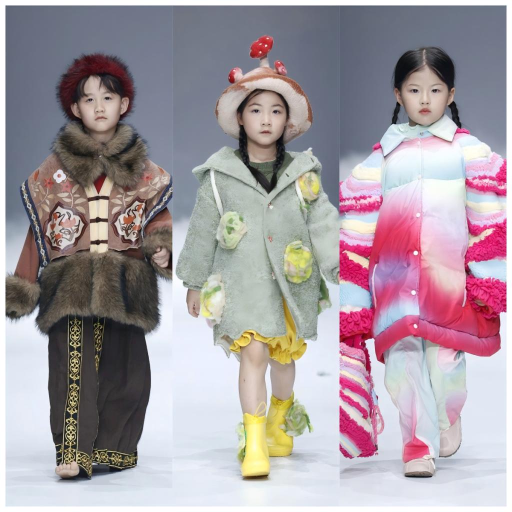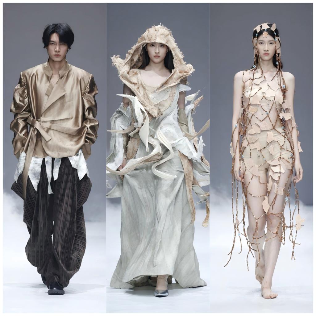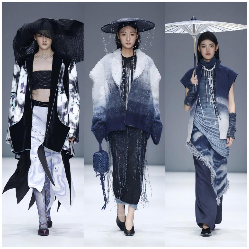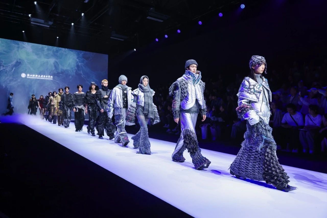 一套套作品相继登场,涵盖女装、男装及童装,融合“时尚 + 文化”“时尚 + 非遗”“时尚 + 数智”三大设计方向。第一篇章“时尚・文化”以钱江潮涌为灵感,运用立体剪裁与像素化山水纹路,将传统美学与现代设计完美融合。第二篇章“时尚・非遗”将羊毛毡与智能温控纱线结合,让非遗技艺在创新中焕发新生。第三篇章“时尚・数智”则借助AIGC技术,将赛博格元素与传统工艺相结合,展现了科技与手工的和谐共生。三大篇章交相辉映,追溯东方传统文化,传承非遗技艺薪火,致敬未来科技浪潮。