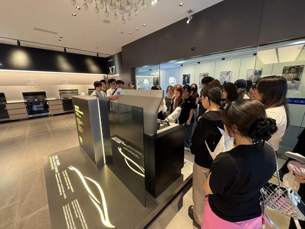 同学们首先来到品牌展厅,这里陈列着火星人多款明星集成灶产品。工作人员详细讲解了产品的设计理念、功能特点,同学们围绕在展品周围,仔细观察并积极提问,深入了解产品如何将多功能与智能化完美融合。