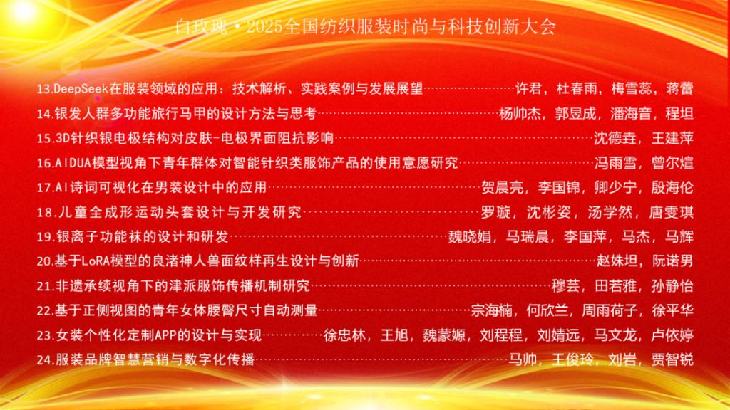 本届大会内容丰富,聚焦行业前沿热点。会议中,多位行业资深专家、高等院校教授和企业技术人员围绕纺织领域科技创新与产业创新融合发展模式、AI驱动的服装产业智能化革新、新型面料研发与应用、智能服装关键技术与挑战、时尚产业链路数字化与AIGC数字时尚传播、2026春夏核心主题趋势、非遗技艺在服装中的创新设计实践、服装智能制造及未来发展方向等热点话题做了专题报告。