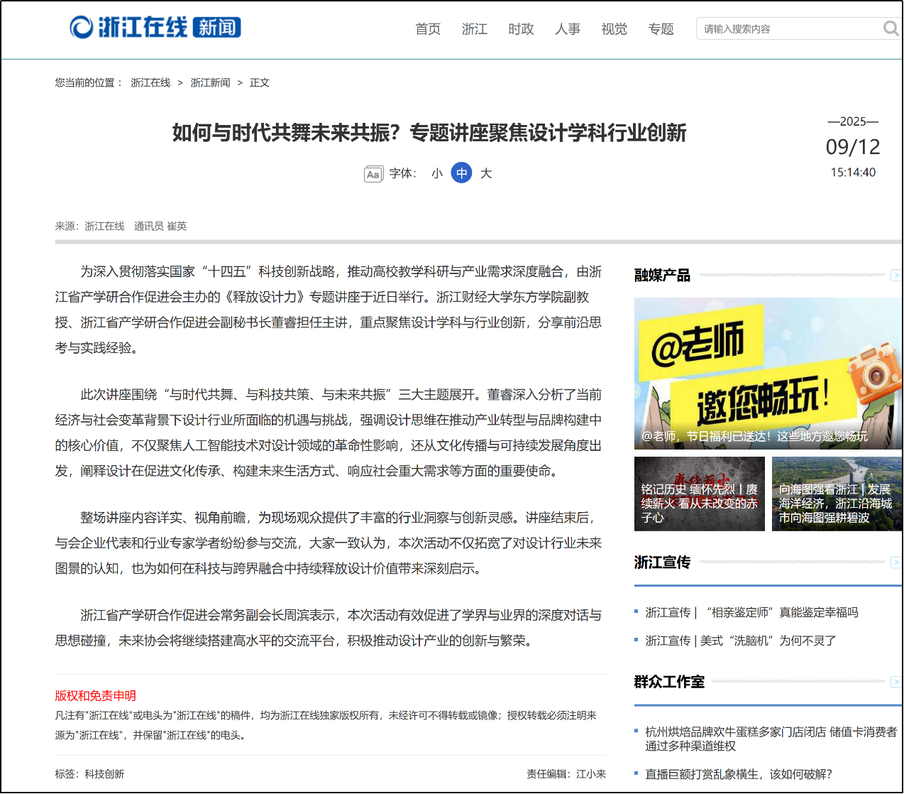 浙江在线作为浙江省主流网络媒体,对本次讲座进行了专题报道,进一步扩大了论坛的社会影响力,也体现出社会对设计创新与产学研融合方向的高度重视。
