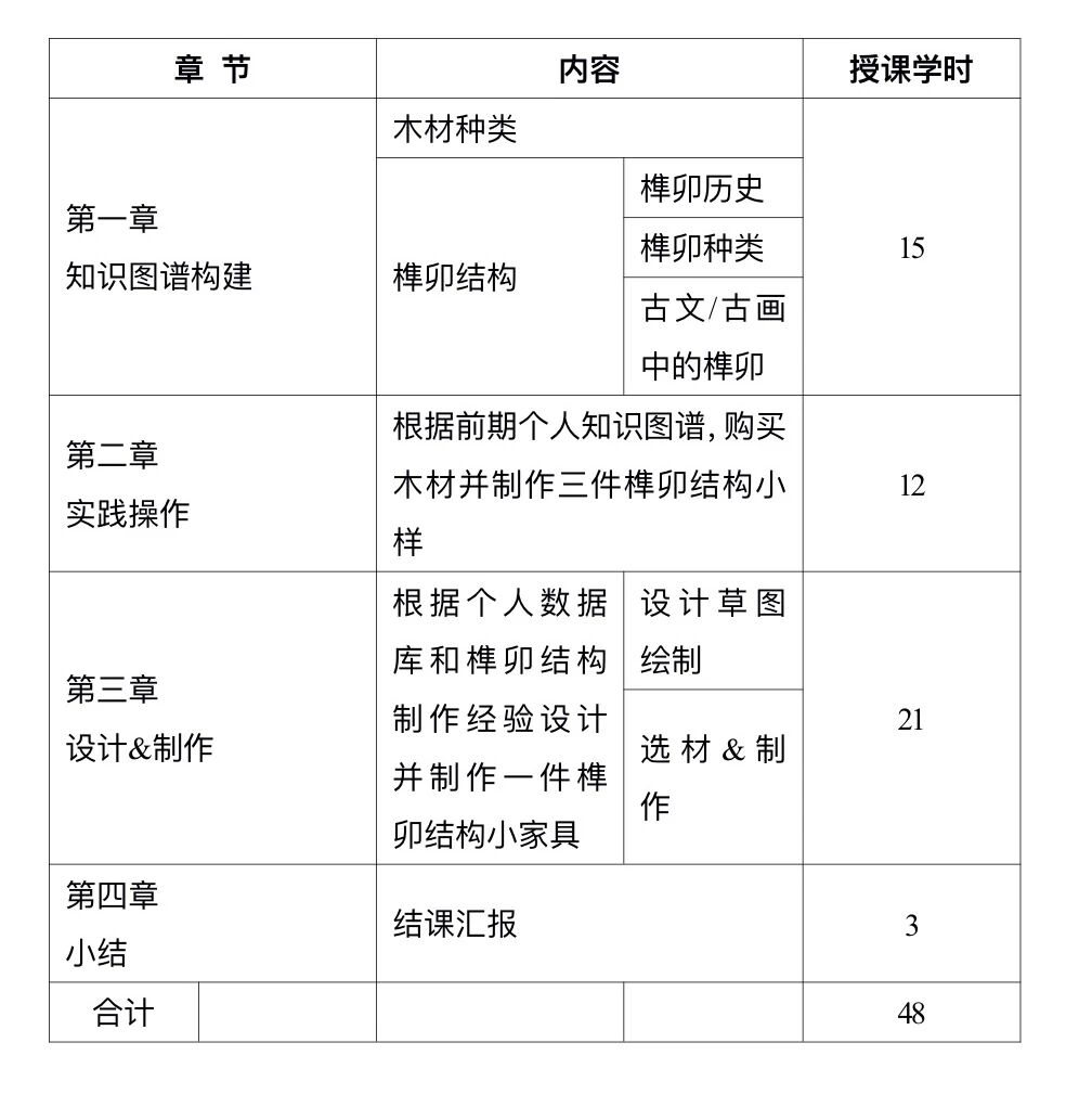 设计与制作(21学时):员工设计并制作一件榫卯结构小家具,从草图绘制到选材加工,完成从理念到成品的全过程。