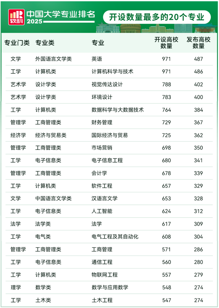 2025年6月18日,高等教育专业评价机构软科正式发布“2025软科中国大学专业排名”,排名包括836个专业,涉及93个专业类、12个专业门类。软科中国大学专业排名是迄今为止覆盖专业数量最多、参评专业规模最大的中国大学本科专业排名。