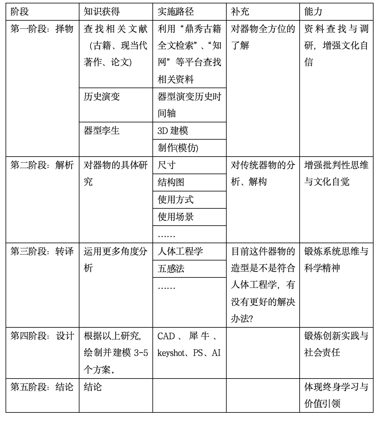 本课程共分五个阶段。第一阶段择物。即从传统器物中寻找感兴趣的造型样式。包括总结之前课程、介绍本课程总体内容、强调手工艺在产品设计中的重要性、介绍本课程所设计的材料——陶瓷除了在《材料与工艺(陶瓷)》中所掌握的技法之外其他的陶瓷成型技法,寻找感兴趣的器物并通过古籍与现当代文献多方位了解器物;运用3D建模的手法使传统器物数字化;第二阶段解析。即对器物的具体研究。包括尺寸、爆炸图、器物在它所在年代的使用方式、使用场景等。陶瓷加工工具及制作手法的介绍和运用,使员工自主关注、学习及掌握制作陶瓷产品的各种技法;第三阶段转译。即运用多角度分析。主要运用前置课程内容人体工程学、五感法等对传统器物分析研究,并进一步分析:目前这件器物的造型样式是不是符合当下社会生活,有没有更好的切入点把过去的器物与现在建立链接?第四阶段设计。即草图绘制和设计。根据以上研究,绘制并建模3-5个设计草图,选出一组建模、渲染,使用场景呈现。第五阶段结论与总结。根据以上研究分析总结传统器物在当下的可行性。