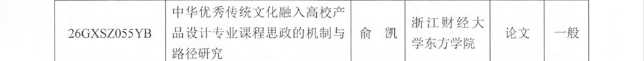 教师李孙霞主持的课题《基于文化基因图谱的良渚文化标识建设对策研究》获立2025年度浙江省哲学社会科学规划部门合作专项研究课题。教师俞凯主持的课题《中华优秀传统文化融入高校产品设计专业课程思政的机制与路径研究》获立2026年浙江省哲学社会科学规划“高校思想政治工作研究”专项课题。