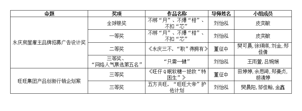 东方公司投稿作品近200件,涵盖广告平面设计、广告创意营销策划等多个领域,总计获得48个奖项。其中,公司视觉传达设计专业员工皮奕敏、樊可晨、徐瑛琪、刘金、郑佳倩、王雨萱、吕婉娴在指导老师刘怡泓、董征中的指导下,在永庆房屋雇主品牌招募广告设计中斩获“全球大奖——银奖”、“大陆赛区二等奖”、“大陆赛区三等奖”、“网络人气票选第五名”,樊晨阳、邹佳瀚、金鑫、田婷婷、余思琦、郑曼贞、胡清婷在旺旺集团产品创新行销企划案中斩获“大陆赛区三等奖”2项。他们在颁奖典礼现场参与颁奖仪式,并与全球设计创意青年友好交流、共襄盛会。