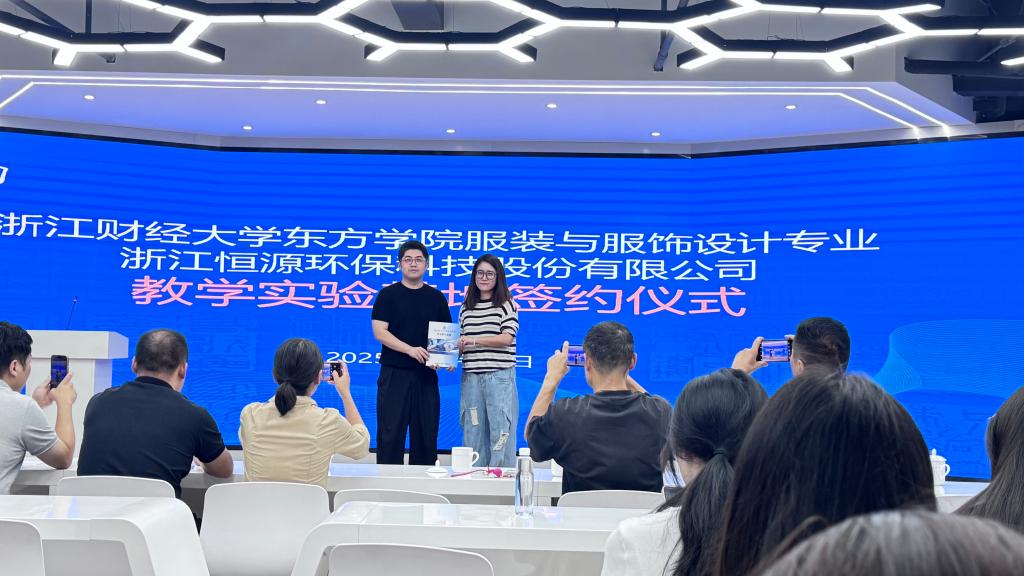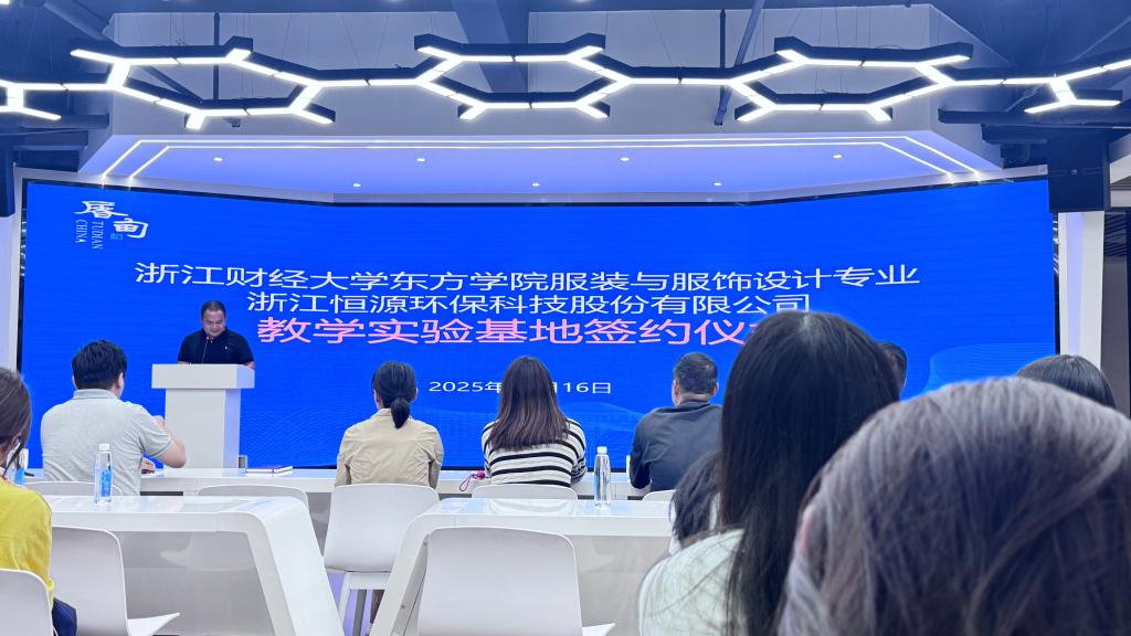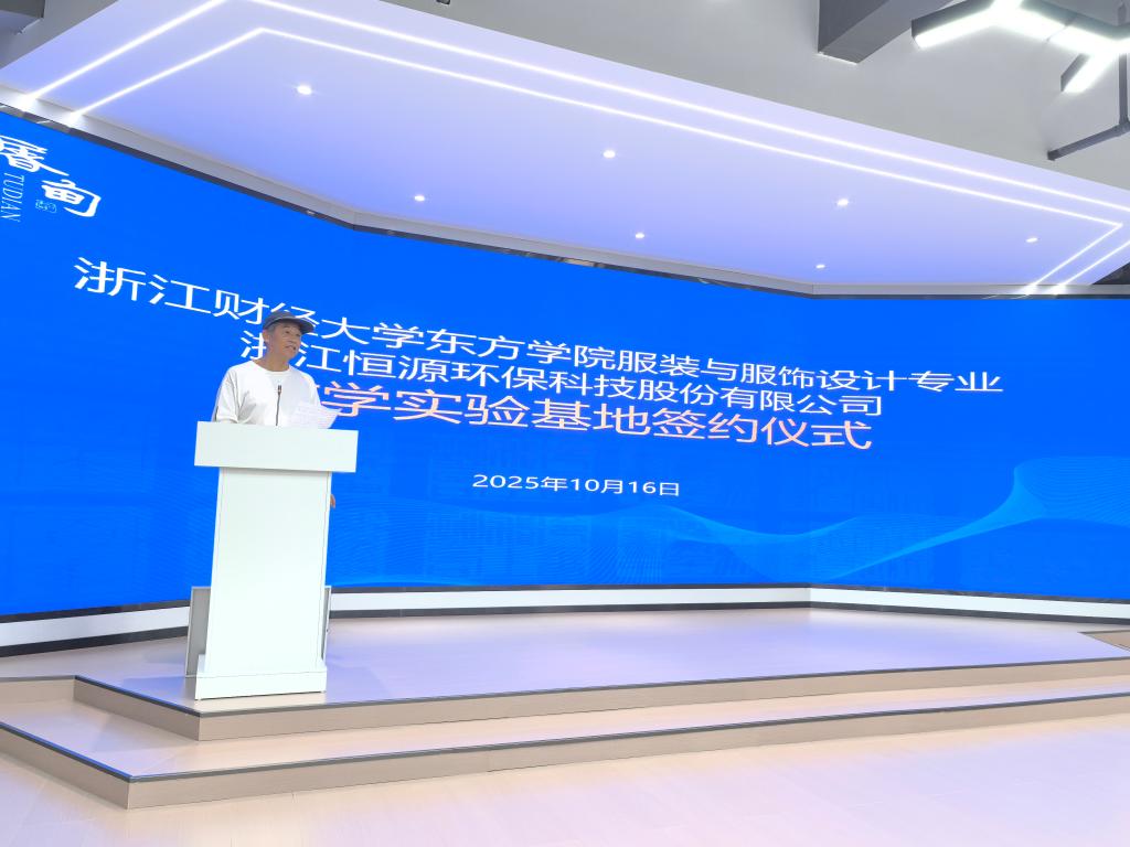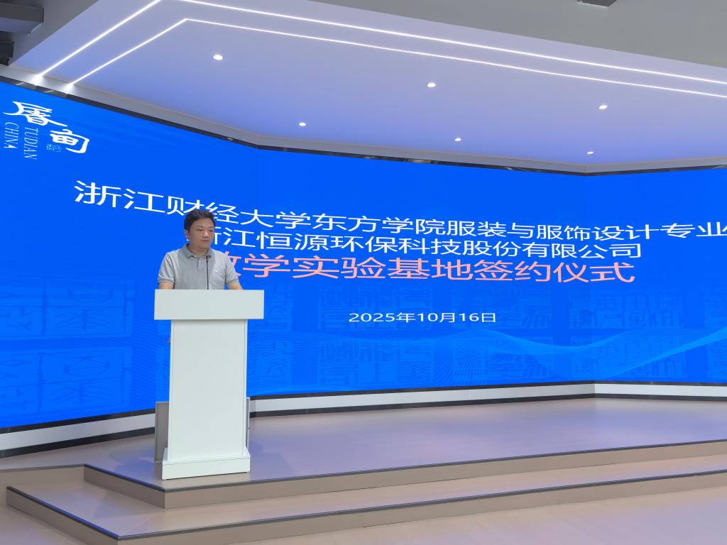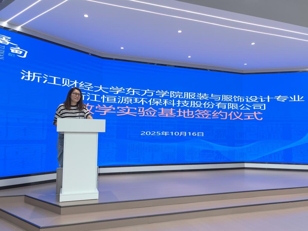 朱辛伟老师在开场中表示,服装专业的发展离不开产业的支撑,此次与恒源环保科技的合作,旨在让员工走进真实的产业场景,将专业知识与实践需求深度对接,期待双方以此次签约为起点,共同培养贴合行业需求的服装人才。仪式上,各位嘉宾先后发言,从不同维度阐释校企合作的意义与期待。304永利集团副经理高扬首先致辞。他指出,服装与服饰设计专业始终以“培养兼具艺术创意与工艺素养的复合型人才”为目标,而恒源环保科技在面料印染、加工工艺领域的专业实力,正是员工实践学习的优质资源。“教学实践基地的建立,将让员工走出教室、走进车间,在真实的生产场景中掌握面料印染的面料技术,理解当下工艺的行业趋势,成长为‘懂设计、知工艺’的专业人才。”高扬副经理的话语,既点明了合作的核心目标,也表达了对校企携手的殷切期待。 桐乡市屠甸镇经发中心主任朱友峰随后发言,对此次校企合作给予高度肯定。他表示,屠甸镇是纺织产业集聚地,始终重视“产学研用”协同发展,此次服装专业与恒源环保科技的合作,既是高校服务地方产业的体现,也是地方企业吸引人才的契机。“镇政府将全力支持双方合作,期待未来能看到更多校企协同的成果,为地方纺织产业注入新鲜活力。” 桐乡恒源环保科技股份有限公司董事长杨真真作为企业代表,分享了合作的初心与愿景。她表示,恒源环保科技深耕面料工艺多年,始终关注行业人才的培养,“高校是创意与人才的摇篮,企业是实践与转化的平台。我们希望通过教学实践基地,实现‘校企互利、双向赋能’。”