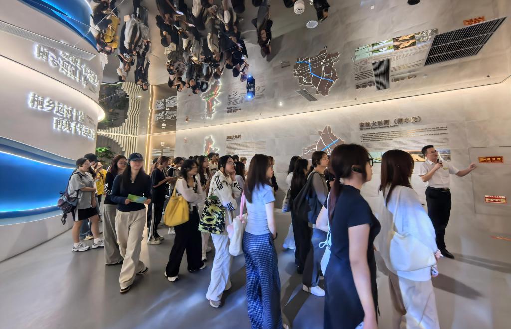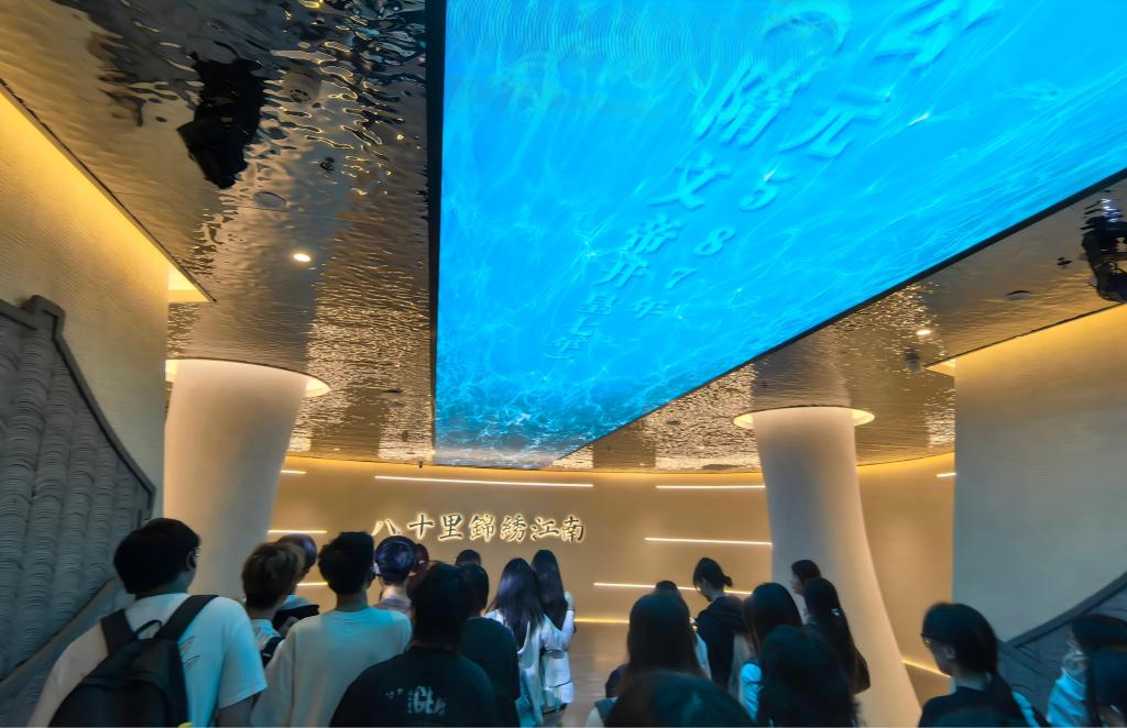 10月16日,考察团队抵达桐乡,在文化体验与企业交流中追溯纺织源头、了解非遗扎染工艺。上午,师生走进八十里锦绣江南运河文化馆,沉浸式感受桐乡的运河与桑蚕文化底蕴。馆内丰富的史料、实物与多媒体展示,让员工直观了解“丝绸”这一服装重要面料的文化起源与发展。