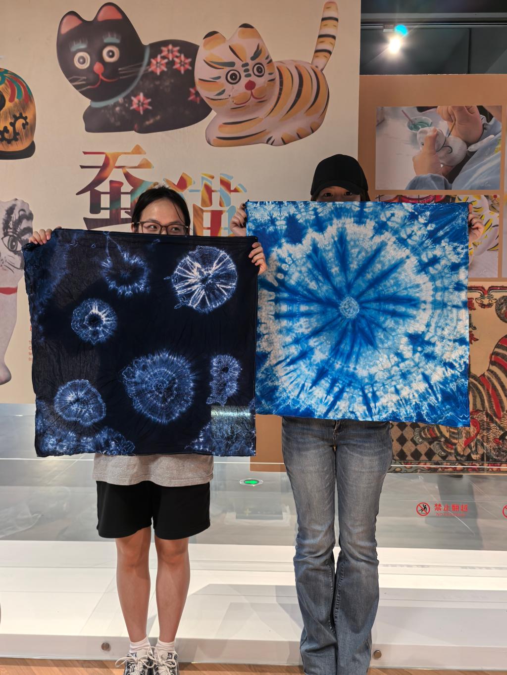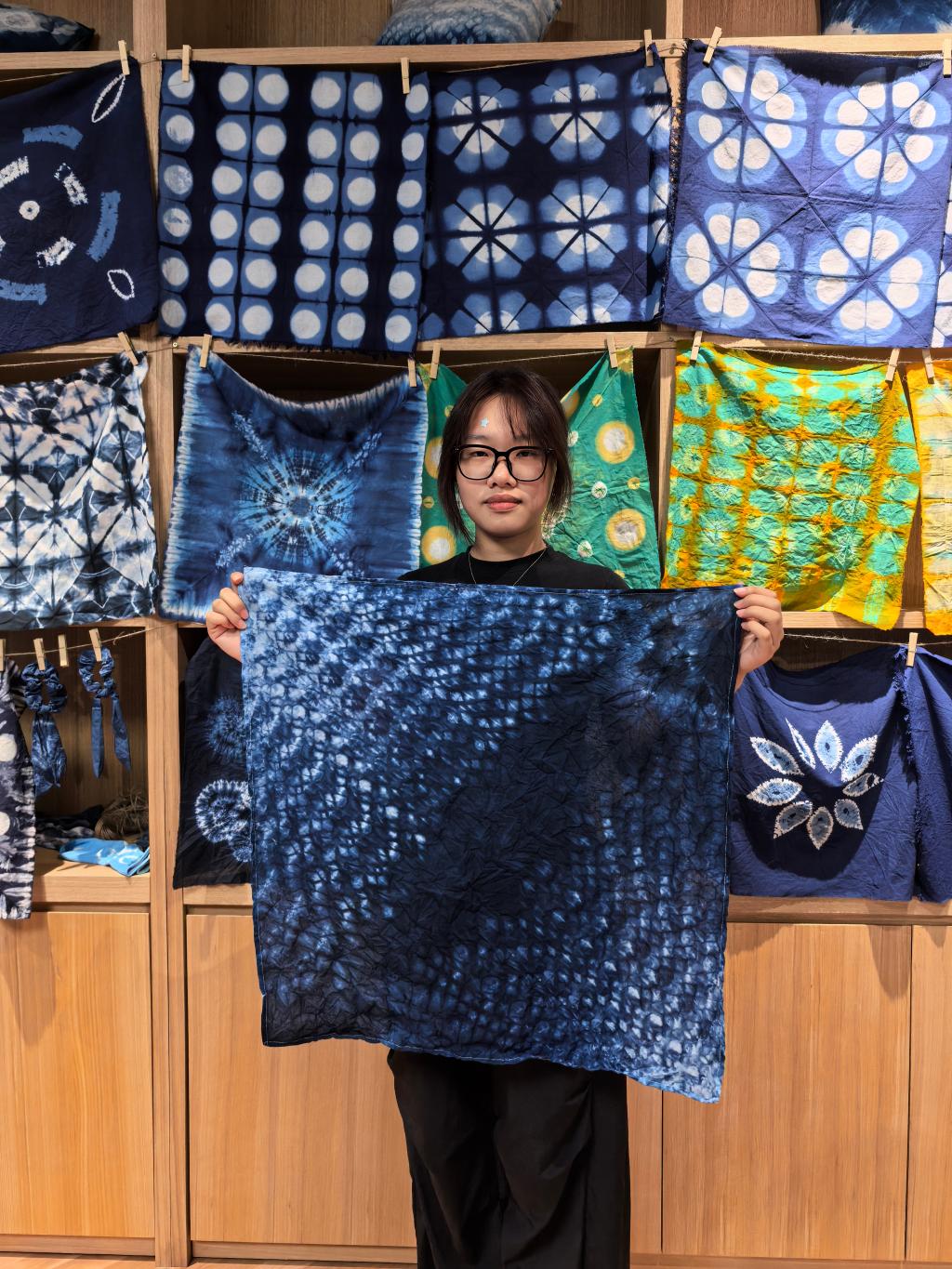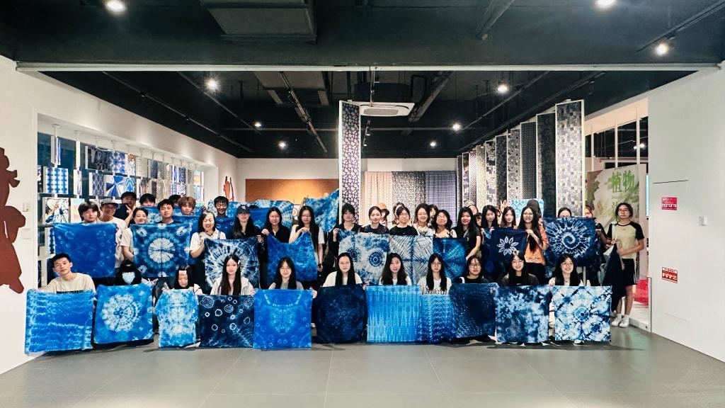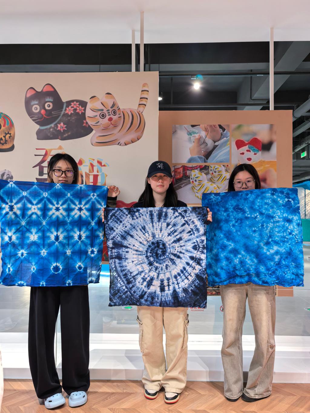 随后的扎染学习环节,更是让大家亲身参与传统工艺创作。从布料折叠、捆扎到染色,每一个步骤都充满挑战与期待,最终完成的作品如同 “拆盲盒” 般充满惊喜,不仅让同学们掌握了扎染基本技法,更激发了对传统手工艺传承与创新的思考。
