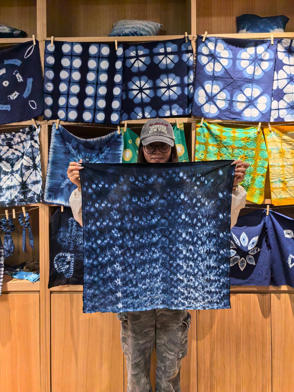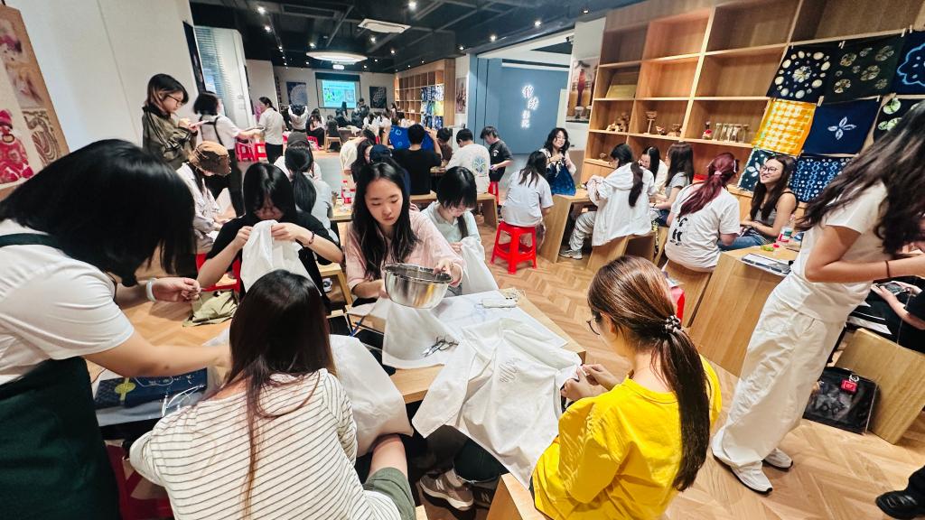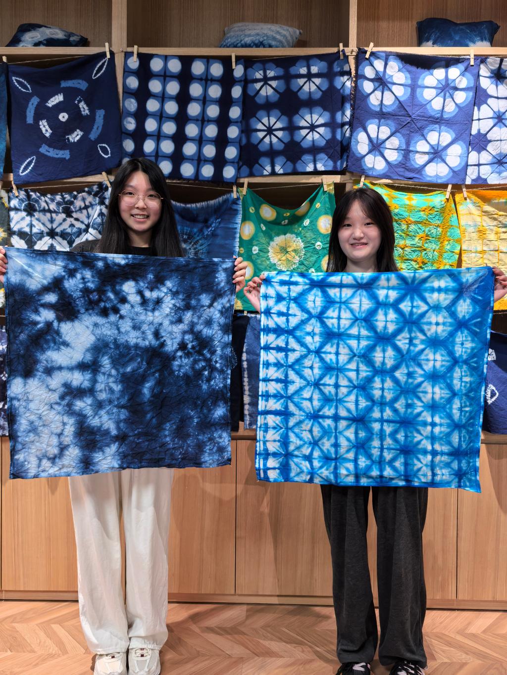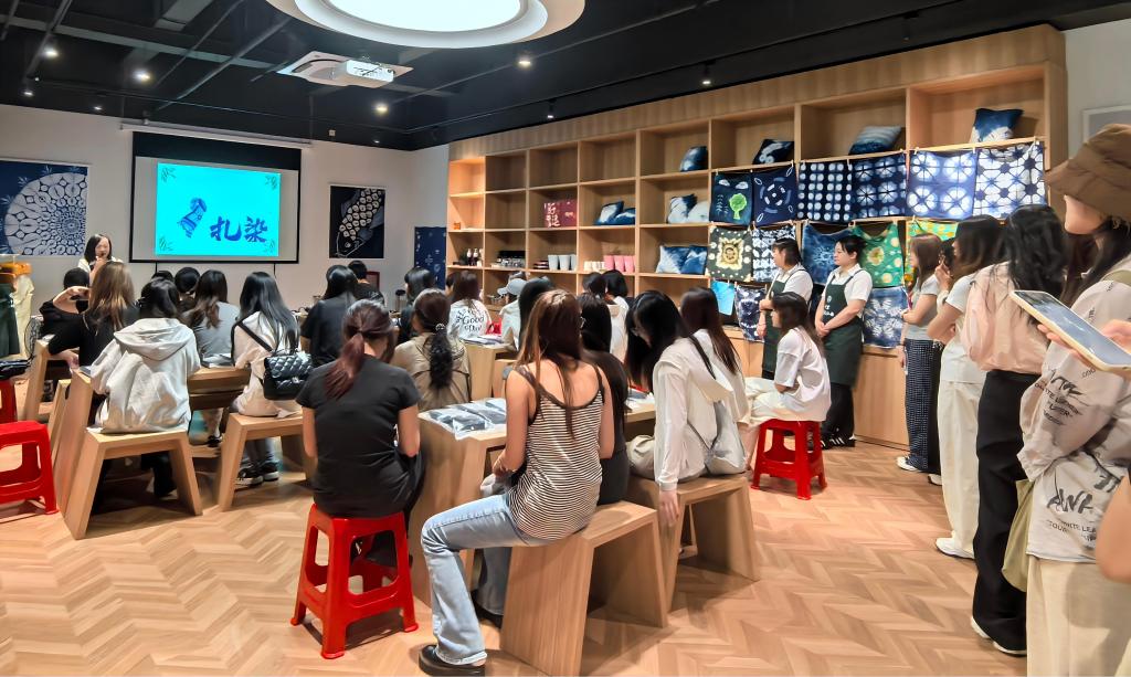 随后的扎染学习环节,更是让大家亲身参与传统工艺创作。从布料折叠、捆扎到染色,每一个步骤都充满挑战与期待,最终完成的作品如同 “拆盲盒” 般充满惊喜,不仅让同学们掌握了扎染基本技法,更激发了对传统手工艺传承与创新的思考。