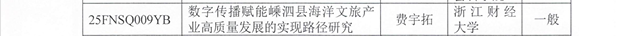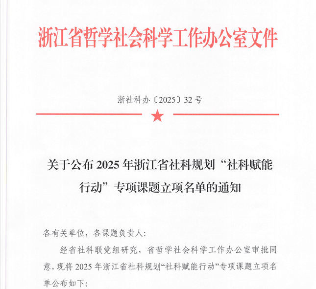 浙江省哲学社会科学工作办公室公布了2025年浙江省社科规划“社科赋能行动”专项课题立项名单,公司教师费宇拓主持的课题《数字传播赋能嵊泗县海洋文旅产业高质量发展的实现路径研究》获批立项。