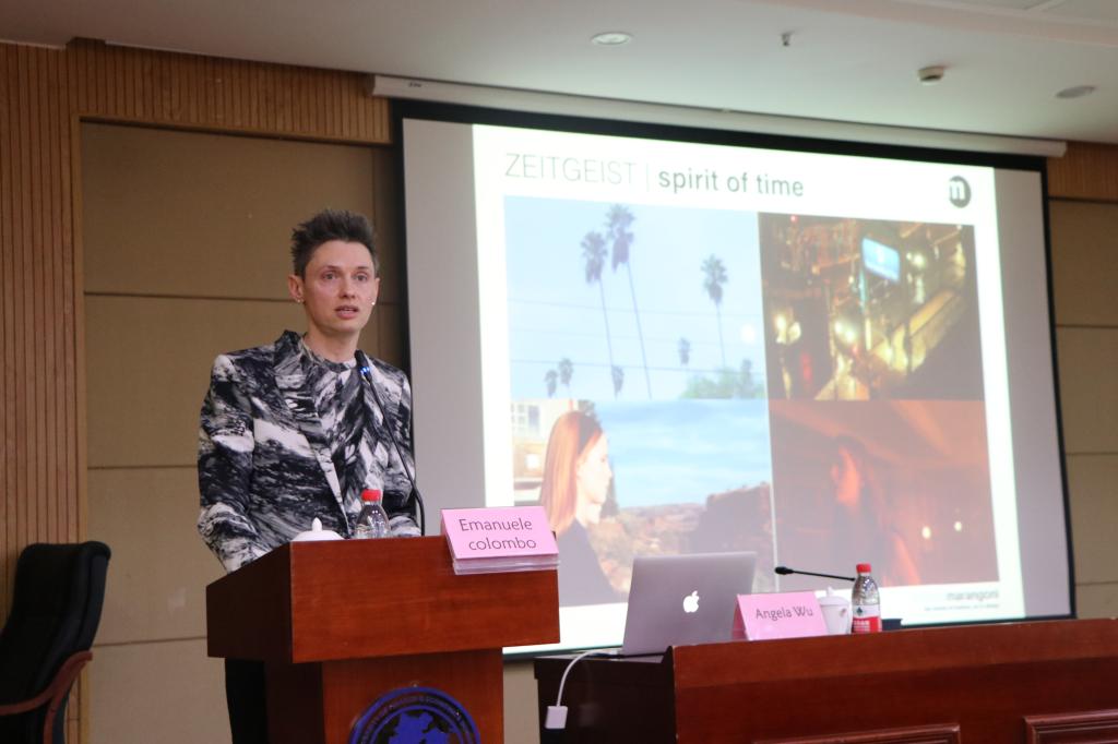 4月26日下午,由文化传播与设计分院主办的“品牌形象识别与未来变化”讲座在学术中心一号报告厅举行。本次讲座由意大利马兰戈尼公司Emanuele Colombo教授主讲,分院副经理刘怡泓主持,服装与服饰设计设计专业师生100余人参加。