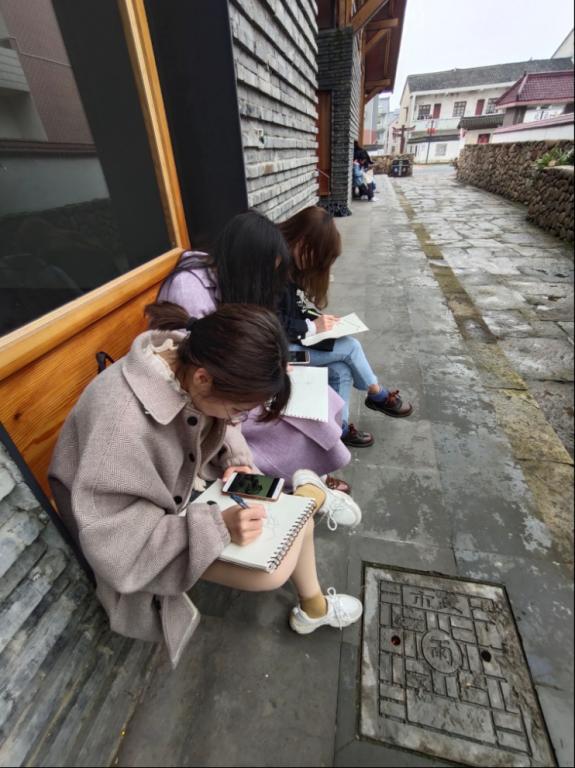 17环境设计系的同学自是不能放过如此诗意的新杭派建筑,结合考察任务,拿起马克笔手绘着建筑的韵律。