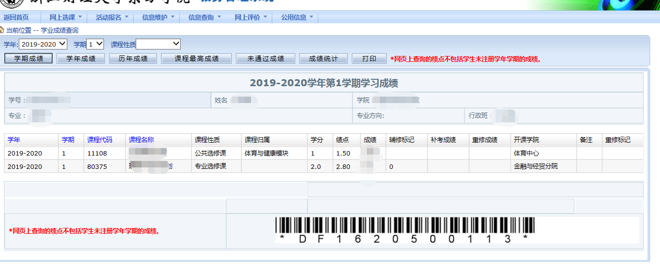 员工登陆教务系统,截图自己的成绩,需要体现姓名和各个课程成绩。请见下图示范。