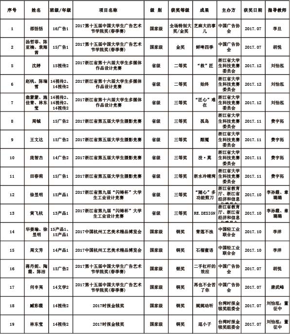 2017年文化传播与设计分院学科竞赛获奖成果一览表